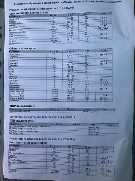 Нам делали узи несколько раз,но есть только эти снимки(( Напишите пожалуйста какие анализы нам нужно сдать чтобы точно выявить эту болезнь! Нам сделали переливаете крови 29.08. и вроде как стало лучше,моя киса кушает,пьёт,но у неё будто сил всё меньше(( в туалет (лоток) она ходит и по маленькому и большому. Лежит в разных позах и крайние 3 дня странно сидит,с опущенной головой и глазки почти всё время открыты(( И ещё сегодня заметила,у неё задние лапки как-будто отказывают