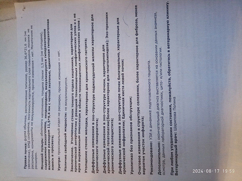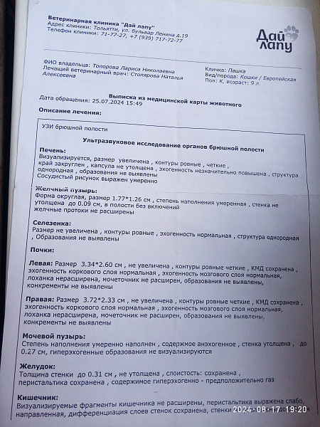 25/07/2024 коту Пашке становиться плохо. Его рвет, у него понос, отказывается от еды.