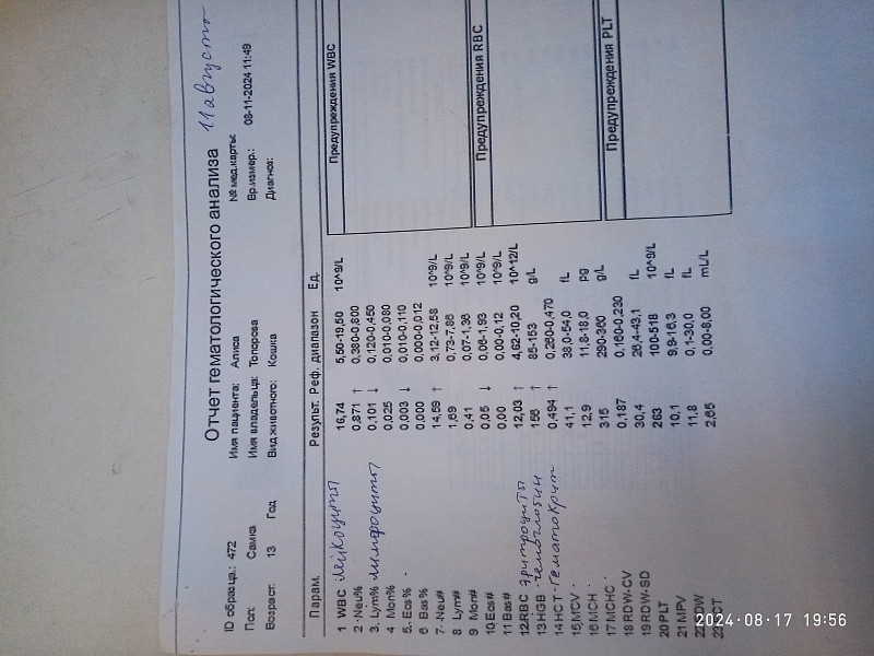 Общий анализ крови. Биохимию не получается сделать, говорят хилез. Два раза пробовали, кровь сворачивалась.