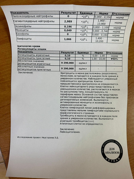 Добрый день! в апреле 25 г. сдавала анализы перед кастрацией, врача смутила блеклая шерсть и небольшой вес (на тот момент 1 год 1 месяц, вес 2,9) по анализам: