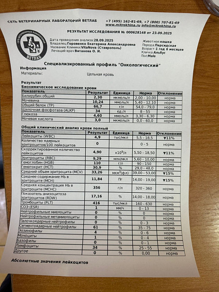 В сентябре 25 г. кота несколько раз вырвало (1 раз переваренным кормом, 2ой - немного желчью), обратились к ветеринару, при сдаче анализа, врач сказал, что очень густая кровь и подозрение на плохую работу печени, по анализу клиники: Ca - 3,48, далее сдали профиль "Онкологию":
