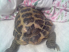У нас заболела сухопутная черепаха. Вид - среднеазиатская. Длина карапакса 12 см, вес около 0,5 кг. Живет у нас 12 лет.