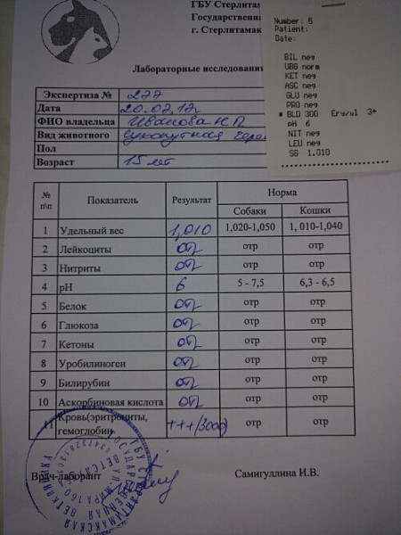 На следующий день сделали анализ крови и мочи. В моче обнаружили кровь. В крови - избыток мочевины и креатинина, а также нехватка кальция и избыток фосфора. Начали лечить по следующей схеме: