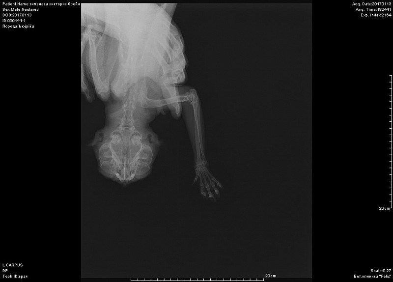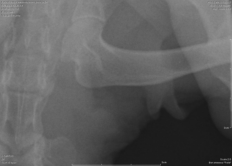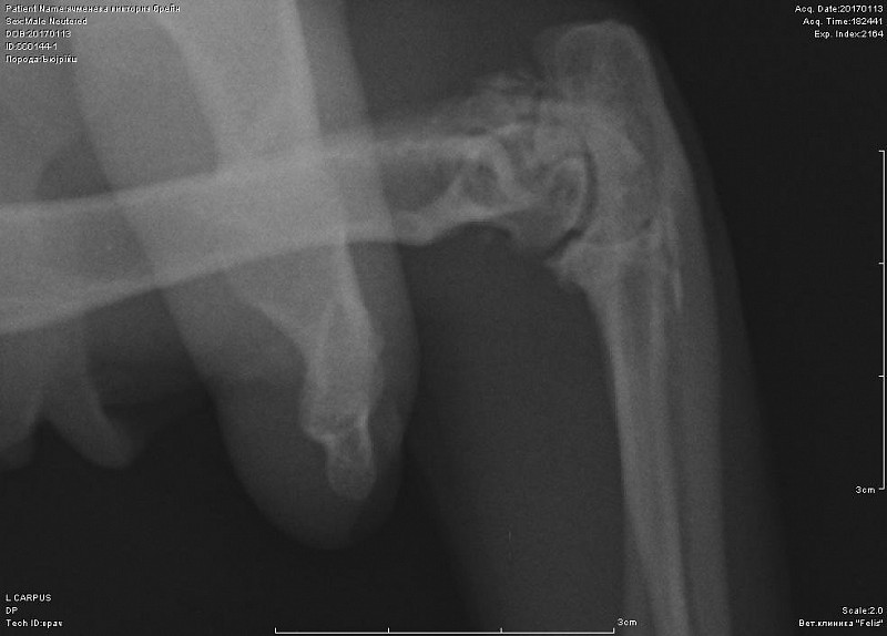 Периодически хромает после долгого лежания.Около 10 дней хромота не прошла, стал не наступать на переднюю лапу-ходит на трех. Повели в к врачу, при осмотре спокоен. Сделали снимок-врач сказал, что был когда-то компрессионный перелом лучевой кости, сказал, что кот хоить нормально больше не будет. Нужно еще мнение, посмотрите снимок, пожалуйста.