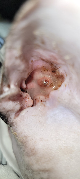 6. Какое лечение проводилось и был ли эффект от лечения - Изначально в ноябре 2024 г. (как только у нас появился питомец) обратились в клинику с жалобой на небольшой расчес 1 уха, на данный момент времени имеется поражение обоих ушей, плюс увеличение околоушных лимфоузлов. Эффект от лечения таков, что пока питомец принимает антибиотики у него вроде бы все в порядке, как только прекращается прием, все возвращается обратно. Лечили нас марфлоксином, кладаксой (2 раза), доксифином, преднифармом, омезом, теперь врач предлагает найти каких-то знакомых в санстанции и сделать посев на антибиотики, но к сожалению, этого сделать я не могу, так как попросту не имею нужных знакомств, а просто так с питомцем меня там не принимают. От отита были назначены такие препараты - суролан, отивет, отоксолан, человеческие капли для глаз левомицетин, отидез и отидез форте, лосьон преотик трис и самое странное - чеми спрей с меколью, которые образовали обширный ожог и потемнение полости ушей. От аллергии - капли зодак, стоп зуд (вообще не помог), подкожные инъекции аллервет (не помогли и которые превратили моего любимца в бессильное существо), шампунь септикея, гепатовет, рыбий жир, фунгивет, септоспрей, дистреп, мелоксивет...Теперь из-за всего этого лечения я смотрю на своего любимца и плачу, потому что изначально то, с чем мы пришли и с чем нам сейчас приходиться бороться, это огромная проблема. Его уши превратились в одно сплошное мясо, которое немного заживает когда мы используем отибиовин, но этот препарат достаточно сильно иссушает внутреннюю поверхность ушек и образуются кровавые трещины, корки, чтобы это снять, проводятся обработки лосьоном эпиотик, но это "помогает" снять корки до образования сукровицы. Таким образом круг замыкается и происходит то, что называется издевательством над живым и беззащитным существом. Наша большая проблема в том, что мы живем в очень маленьком населенном пункте другой страны и обратиться по сути больше не к кому, а здешние врачи лишь разводят руками на результаты своего же лечения, которое к сожалению за целый год реально угробило здоровье моего члена семьи. Пожалуйста, если вы можете дать какой-то вариант и назвать (хотя бы предположить) заболевание, буду вам искренне благодарна, т.к до сих пор нет никакого точного диагноза и протокола лечения.