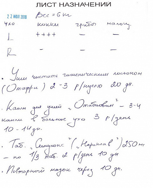 В конце сентября я обратилась в другую ветклинику, мазок из уха не брали, отметили, что ухо воспалено внутри, выписали Лоратадин 5 мг./1 раз в день, капли Полидекса 2 р/день - 10 дней. Улучшения временные были, после отмены лечения - опять гной.
