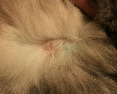 Дней 5 назад он выкусал шерсть под лопаткой, я увидела там покраснение и некоторое подобие язвочек раскусанных, хотя возможно это была скусанная кожа. Помазала зеленкой, чтобы прижечь. На утро покраснение прошло, зеленку он конечно успешно слизал. И вот сейчас обнаружила на этом месте плотную корку кожи, как нарост, покраснение и прилипшие к коросте волосы.