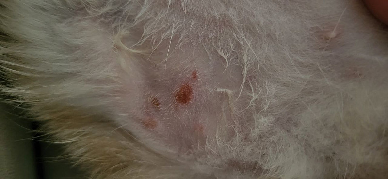 4. впервые появление зуда у кота отметили в августе 2020года. Накануне, до появления первых жалоб, начали контактировать с уличным котом ( кота возили в вет.клинику, обработали от блох, где и уверили, что у кота нет лишая или других кожных заболеваний, единично были замечены крупные особи блох, сбрили крупные колтуны ) один день кот пробыл в квартире, с домашним котом не контактировал, вечером этого же дня кот был отпущен на улицу, (где и находится по сей день, уличного кота обрабатываем от блох, при контакте с самим котом обрабатываем обувь спреем .FLEE по приходу домой сразу моем руки, обувь убираем с пола, разуваемся в подьедзе). Через несколько дней у домашнего кота начался зуд в районе правой голени. Голень разлизывается до корост, площадь разлизывания - все пузо ( остался совершенного лысым) Обратились в ветклинику, где посоветовали препарат метипред с постепенным повышением и снижением дозировки до полной отмены, на фоне приема препарата у кота развился ГКС-индуцированный сахарный диабет, только благодаря Вашему форму сейчас кот здоров, показатели глюкозы в норме. Зуд прошел,шерсть наросла, но в январе 2021года снова все повторилась, коросты стали появлятся по ходу позвоночника у хвоста, в связи с чем, кот разлизывался до проплешин, обратились в ветклинику к врачу дерматологу, на приме был 5. взят соскоб, микроскопически личинок блох не обнаружено, только волос по тему "метелки", что говорит о постоянном разлизывании. 6. Рекомендовано обработка кота и помещения в течении 3х месяцев. Действительно, жалобы купировались, шерсть наросла, но опять история повторилась в июле 2021года, проделали туже схему - без результата, купировалось самостоятельно. надевали на кота воротник, обрабатывали спреем антизуд. Ремиссия возникает так же спонтанно как и сами рецидивы. Январь-февраль 2022года возобновление симптомов - обращение к эндокринологу - дерматологу, рекомендовано обработка от блох, замена корма на гипоаллергенный. внутрь зодак в каплях, наружные обработки с левомеколем. Успешно. Ремиссия в течении 3х месяцев. и вновь несвязанный ни с чем рецидив,снова воротник, снова ремиссия. Август 2022года уезжаем на 3 недели, оставляем кота на попечение подруги, по приезду отметили появление шерсти в области пуза ( радость ! нет зуда !), но буквально через несколько недель снова разлизывание до кожи, без корок. октябрь 2022года - ужасные корки на голенях справа и слева.