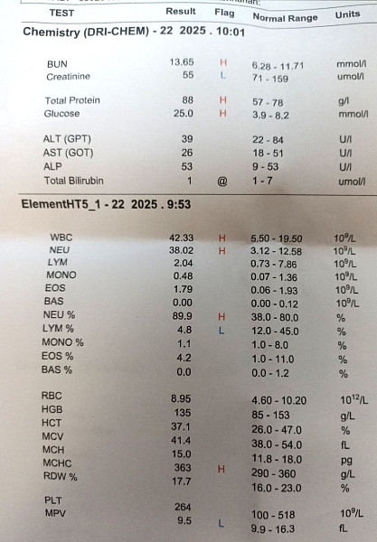 22.09.2025 - сдали анализ крови и мочи (прикреплю сканы), по УЗИ (хр. воспаление в толстом и тонком кишечнике, утолщенный почечный слой, измененная эхогенность, незначительно расширенная лоханка, визуализируется эхоакустическая тень в лоханке). Назначили антибиотик (Энроксил), Папаверин.