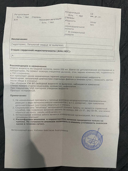 24 марта этого года, после такой зимы, заметила задние лапки отекли и без рингера, сходили к другой кардиологу (3), она тоже поставила ГКМП, сделали торакоцентез уже 150 мл (до этого были только 40 мл четыре месяца назад впервые в жизни), цитология этого транссудата не показала ни онко клеток, ни воспалительных.