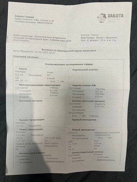 Однако через неделю после того торакоцентеза в 150 мл, днём обнаружила впервые ЧДД 30 (зимой при поставленном ГКМП и при рингерах было не больше 20-24)- снова нашли нового кардиолога (4) и она откачала уже 200 мл. Услышав, что неделю назад уже откачивали 150, предположила лимфому и снова взяла цитологию, но она снова была прозрачный транссудат без каких-либо атипичных по результатам новой цитологии. Но она засомневалась в нашем диагнозе ГКМП, мол ЛП/Ао снизилась за зиму с 2.1 до 1.1, и никогда легкие не отекали а только плевральная, и стенка не настолько толстая чтоб ставить ГКМП, и в целом до этого всю зиму мы были почти что без диуретиков (по три дня в каждом месяце). Отмечу что между двумя этими торакоцентезами 24.03 и 31.03 мы начали принимать Ветмедин 1.25 по половинке в день по настоянию третьего кардиолога,которая нам выкачала 150 мл, не могло ли это поспособствовать такому нетипичному для нас +200 мл ровно за эту неделю приема Ветмедина без вообще каких-либо вливаний всю эту неделю и без новых лекарств (остальные были обычные норваск (но даем хаотично его) и корпидогрел были). Прилагаю УЗИ сердца от 31.03, после торакоцентеза 200мл. Помогите поставить диагноз - ГКМП или что?