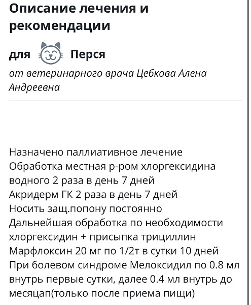 Состояние опухоли на данный момент: 3 недели назад у нее вскрылась опухоль, не могли найти время свозить к врачу , вот 4 дня назад повезли , посмотрели , дали рекомендации по облегчению жизни и ей и нам. ( прикладываю фото рекомендаций) сказали , что должна рана затянуться , обрабатываем 4 день , результата пока не видно , засомневались, что это затянется само( фото, правда фото до выполнения рекомендаций , сейчас эта пломба более подвижна, будто шире стала дырка ) во- первых , рана не уменьшается , во вторых стоит ужасный запах и за эти 4 дня он стал только хуже( мы так понимаем она гниет ) . Нас смущает эта зеленая плямба. Ситуация такая , когда мы обрабатываем хлорогекседином со спонжем, эта штука будто отодвигается и там видно ямку , вот в связи с этим и вопрос: « нужно ли это уплотнение удалить ( самостоятельно или врачу ) и можно ли? Или это трогать нельзя и только действовать по рекомендации онколога и рана действительно сама затянется ?