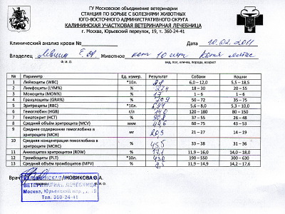 Опухоль не росла до последнего времени и даже начала постепенно зарастать шерстью. Однако 8 февраля я обнаружила, что кот лижет ее, а опухоль кровит(то ли он ее разлизал, то ли она вскрылась). 10 февраля опухоль иссекли, сегодня я узнала, что гистология показала мастоцитому. Общий клин. анализ крови в день операции: