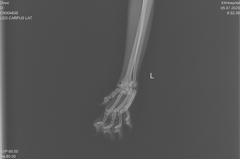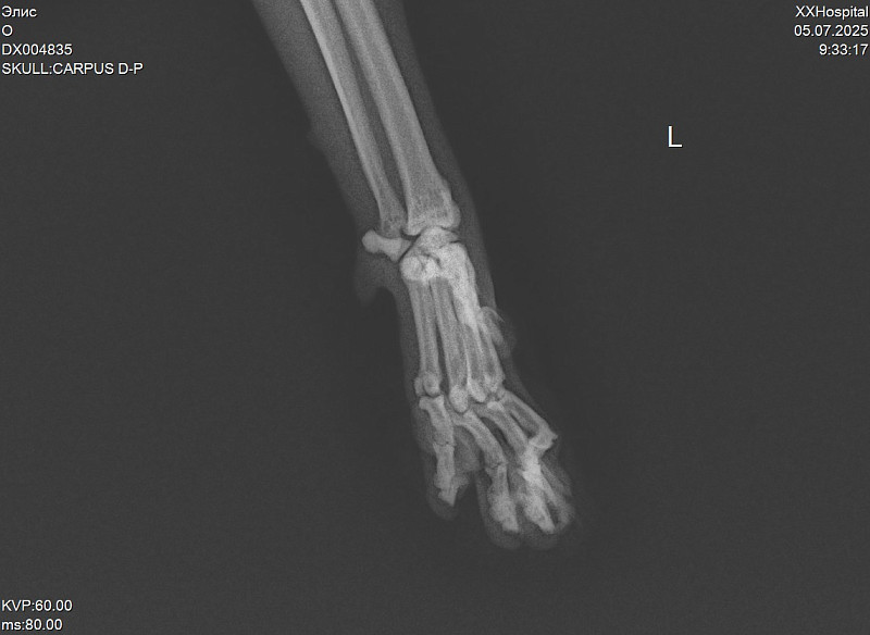 5 июля кошка выпала из окна 2 этажа. Нашли ее под окнами, была в положении когда лежит как бы на 4 лапках. Когда взяли на руки очень кричала. Она хромала, на переднюю левую лапку не наступала, прижимала к себе. Сразу обратились к врачу в клинику Высота. Сделали снимки, перелома нет, сказали что разрыв связок. Прописал иммобилизацию (хотя повязку и ничего другого не предложили), и таблетки НПВС. Ждать 1,5 недели. после чего сказал, что если не поможет нужна операцию по стабилизации сустава. Все снимки и док-ты прикладываю. Прошло 1,5 недели, она стала активнее, но на лапку не наступает - изредка использует. Когда становится на нее, то она у нее как бы изогнута вовнутрь и пальцы в разные стороны разъехались, хотя она ими шевелит и как обычно сжимает их, иногда даже дерет ей когтеточку. Непонятно какой степени разрыв.