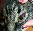 Кот получил травму - удар по голове, в результате белки и один глаз стали красные, кровью налились.