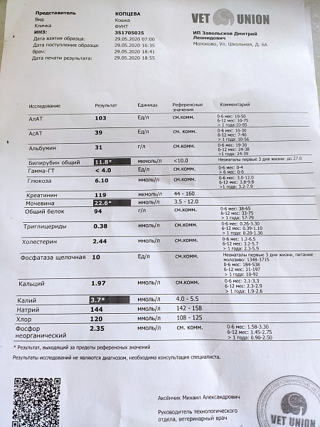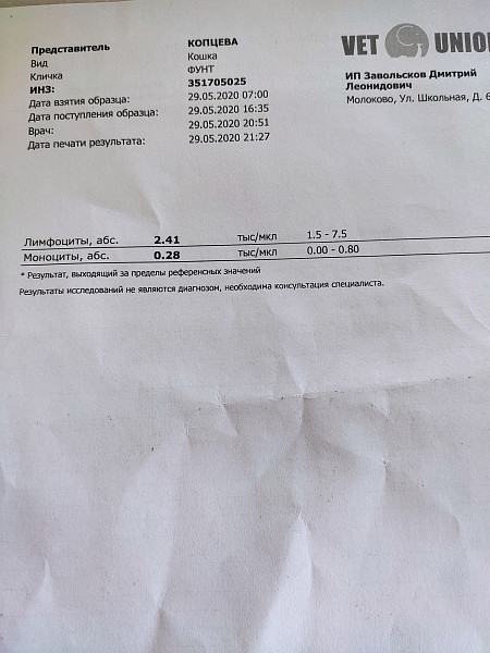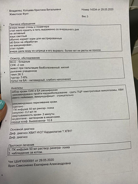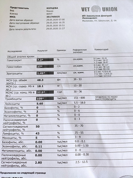 Вакцинация не проводилась , последняя дегельминтизация была осенью. Обработку от блох не проводили ,животное домашнее без свободного выгула. Пару дней назад стал неактивным, вялым, апатичным. Есть очень мало, так же мало пьет. Начал лизать стены. Кастрирован. Язык очень бледный.Принесли его в местную клинику. Сдали кровь, сделали рентген и узи. Сейчас только колим Рингер Лока по 50 мл 2 раза в день. Анализы ниже. Буду благодарен за рекомендации, что делать в первую очередь.