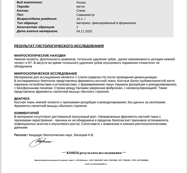 Добрый день. У кошки как указано в КТ исследовании наблюдаются выраженные диструктивные изменения костей верхней челюсти, что наиболее характерно для опухолевого поражения (наиболее часто у кошек при плоскоклеточной карциноме). Резорбтивное поражение зубов может служить фактором роста опухоли в рот полости. В гистологическом диагнозе описано исследование тканей нижней челюсти, хотя поражена верхняя. Надо уточнить у лечащего врача, откуда брали материал. Даже если материал брали из пораженной челюсти, возможно такое, что не попали в сам очаг поражения, а только вокруг, и тогда это не будет достоверным.