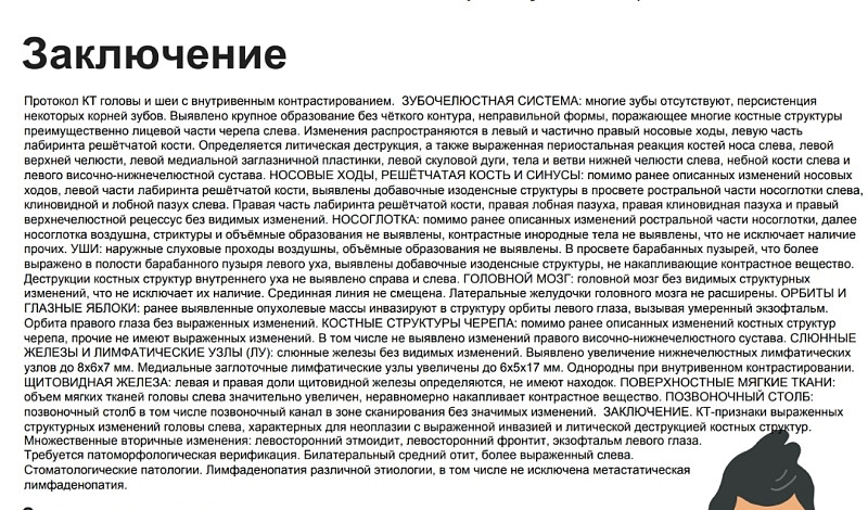 (По результатам КТ выявлено объёмное новообразование челюсти, фронтит, этмоидит, балатерально средний отит. Присутствует птиализм, синдром хорнера левосторонний, истечение гнойно катарального типа из левой ноздри. Региоральные лимфоузлы пальпально спокойны. Pr исследование грудной клетки - признаки неопластического процесса не визуализированы.)