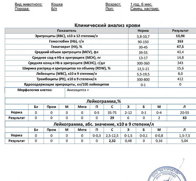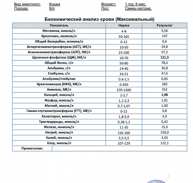 Здравствуйте, на днях коту 1,5 года делали анализ крови клинический и биохимию. Что могут означать некоторые завышения и понижения показателей. Е вет врачу на очную консультацию пойдем, просто к чему готовиться.