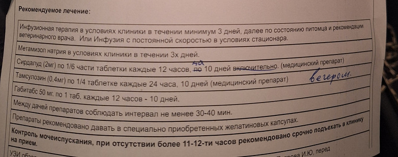Все что можно делать терапевтический, это как-то бороться с мочекаменной болезнью (струвитный тип можно даже вылечить с помощью диеты; иной тип сложнее-остается только мочегонить и придерживаться диеты под данный тип камней, чтобы снизить скорость нарастания этих камней, опять таки о природе камней иногда приходится только гадать, т.к. окончательный их состав можно узнавать только по спектрометрии). Снижать воспаление в уретре с помощью НПВС (как Онсиор, Мелоксикам), его можно думаю и сейчас подавать вам (раз он лижет себе область гениталий), но коротким курсом (следить, чтобы не развился на нем гастрит-в виде рвоты, поноса, снижения аппетита). Расширять уретру (Тамсулозином).