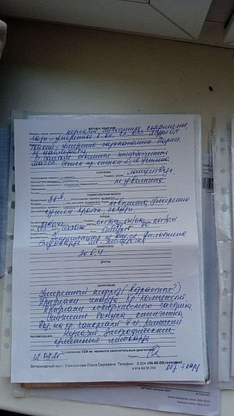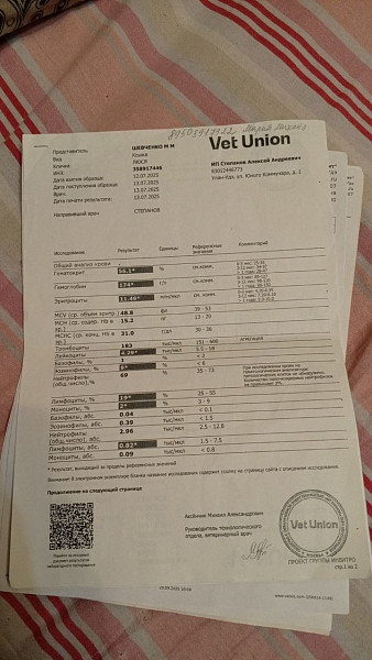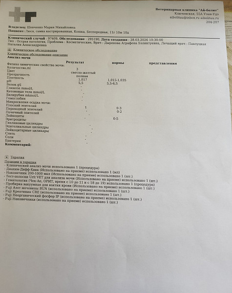 Симптомы, изменения поведения: вялость, депрессивность, малоподвижность, нежелание играть, пониженный аппетит, мало пьет. Сильная линька, перхоть иногда появляется (до этого никогда не было перхоти). Очень ластится, никогда в таком большом объеме не дарила нам свою любовь. Реже мочится, кал ежедневно (но твердоватый и мало, такой был всю жизнь). Рвет в последнее время тогда, когда переест травы (трава+шерсть выходят, иногда с пищей), последняя рвота – 14 марта.