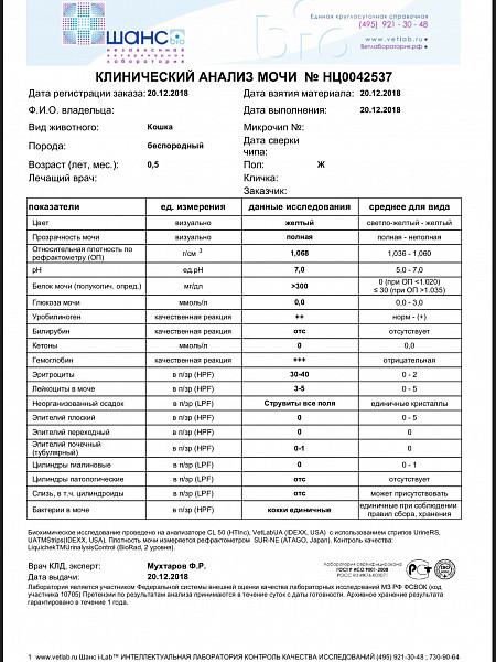 20.12. повторно сдали анализ мочи. К сожалению, результаты не радуют. Но новых симптомов не появилось, кошка активная. Завтра к врачу.
