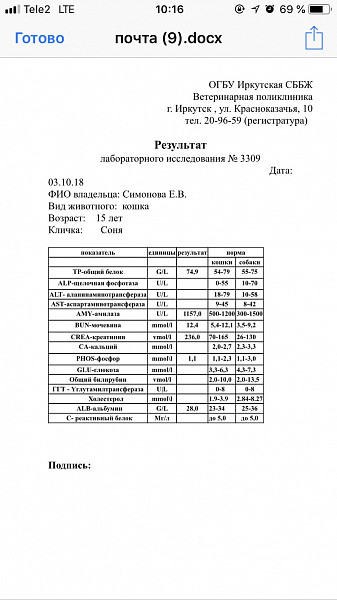 Добрый день! Кошка 15 лет внезапно ослепла, на приеме у ветеринара установили отслоение сетчатки, вследствии повышенного артериального давления, подозрение на хпн. В глаза капаем эмоксипин, индоколлир, визомитин 15 дней, дицинон 7 дней и фуросимед 2 дня внутримышечно. Кошка чувствует себя хорошо, не смотря на то что не видит ничего ведёт привычный образ жизни, кушает, ходит в туалет без проблем, никаких других симптомов и странности в поведении нет. Пьём зоокард. Сдали биохимию крови( результаты прикладываю) врач посадилтна диету, корм нф и в дополнении здоровые почки таб. Вопрос мучает действительно ли при таких показателях кошка могла ослепнуть вследствии проблемы с почками? Или возможны какие другие варианты?