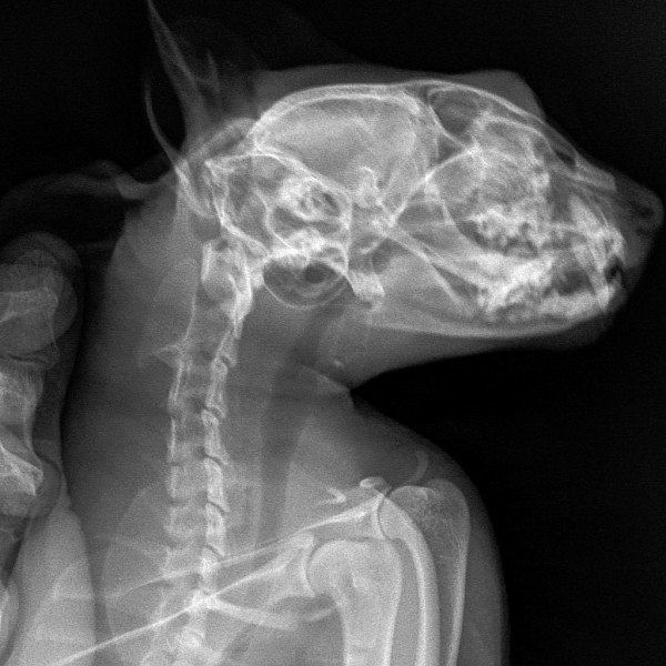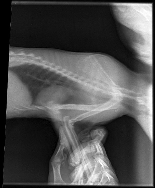 На снимке сбоку врач изменений не обнаружил. Лёгкие отличные, позвоночник отличный, сердце чуть увеличенное, но для её возраста это норма. В желудке есть небольшие кусочки пищи.