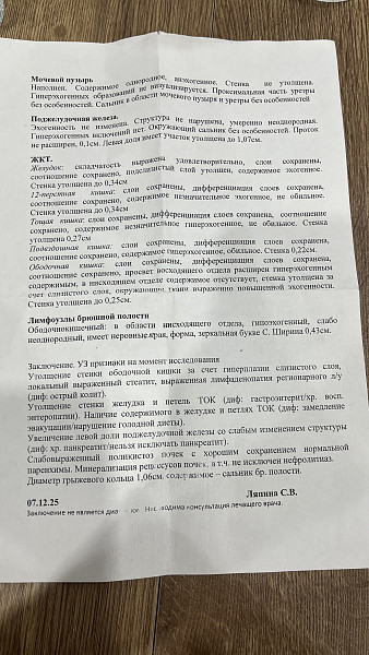 4 декабря резко без предвестников начались частые тенезмы с выделением слизи коричнево-красного цвета с тухлым запахом. Поехали в клинику. Врач пропальпировал прямую кишку и сказал, что параанальные железы воспалены, забиты - он их прочистил. Температура была 40. Поставили литичку, папаверин и маропиталь - состояние улучшилось. Назначили габапентин на 7 дней, отпустили домой, записали на УЗИ ОБП на 7 число. В течение этих трех дней тенезмы сохранялись просто со слизью, в туалет ходила маленькими какашками.