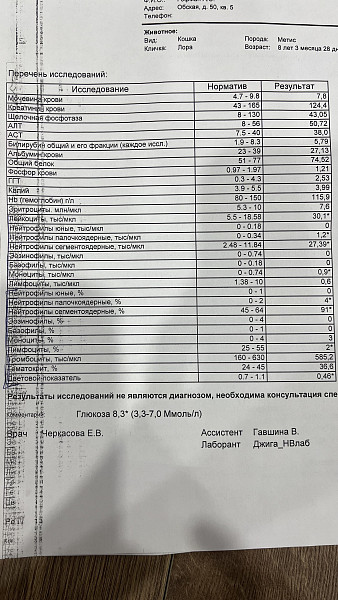 Ей сделали клизму на всю кишку (кала было очень много, все какашки сухие), поставили Фриостерин, Маропиталь, Литичку, Папаверин, Габапентин (что-то уколами, что-то инфузией). После получение анализов начали Амоксигард. В общем, кошечка провела там несколько часов, потом позвонили, сказали, что она стала гораздо лучше себя чувствовать, начала проявлять интерес к пище и всех там перекусала и перецарапала. Сказали, что лучше ей ночь переждать дома в спокойной обстановке, а на след день вернуться. Дежурный врач сказал, такой лейкоцитоз и резкое начало всей этой ситуации похож на абсцесс.