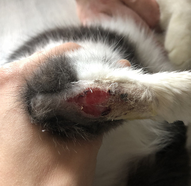 Здравствуйте. У кота, 3 года, несколько дней назад появилась кровоточащая рана в области скакательного сустава на задней конечности, кот не хромает. На улице не бывает, вероятность что поранился маленькая. Неделю назад заболел кальцивирозом, делали инъекции циклоферон внутримышечно, сейчас ничего не принимает. Повязку упорно разлизывает, то есть рана либо зудит, либо болит. Вет врач точного заключения сделать не смог, назначил антибиотики и обезболивающее, предположил что это психогенное разлизывание и имеется вывих. Подскажите пожалуйста мог ли кот вывихнуть лапу или это последствия болезни или лечения от кальцивироза?