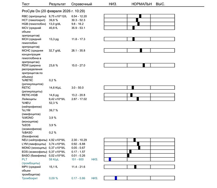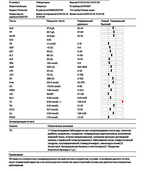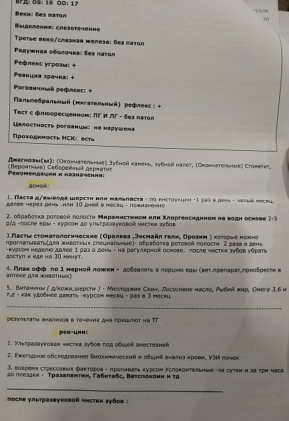 20.02.26 были на приеме у терапевта-офтальмолога, на УЗИ и взяли анализы крови. Результаты и выписку из мед карты прикладываю. Исходя из БАК, Креатинин 212, поставили 2 ст. ХПН. Вероятно – гиперхолестеринемия. В ОАК тоже не все гладко. По УЗИ изменения в почках, взвеси в полости желчного пузыря, безоар в просвете желудка. Давление в норме, с глазами тоже норма, под вопросом увеит. Зубной камень на молярах, гиперплазия десны, стоматит. (Не знаю, к сожалению, нужно ли дублировать все заключения, текста и так много).